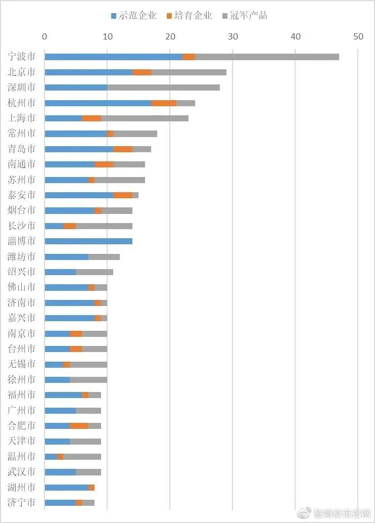 第一種是綜合型城市,例如寧波市、煙臺(tái)市、南通市、南京市、濟(jì)南市、天津市等城市,單項(xiàng)冠軍企業(yè)分布的領(lǐng)域較多,沒(méi)有相對(duì)主導(dǎo)的制造業(yè)領(lǐng)域;