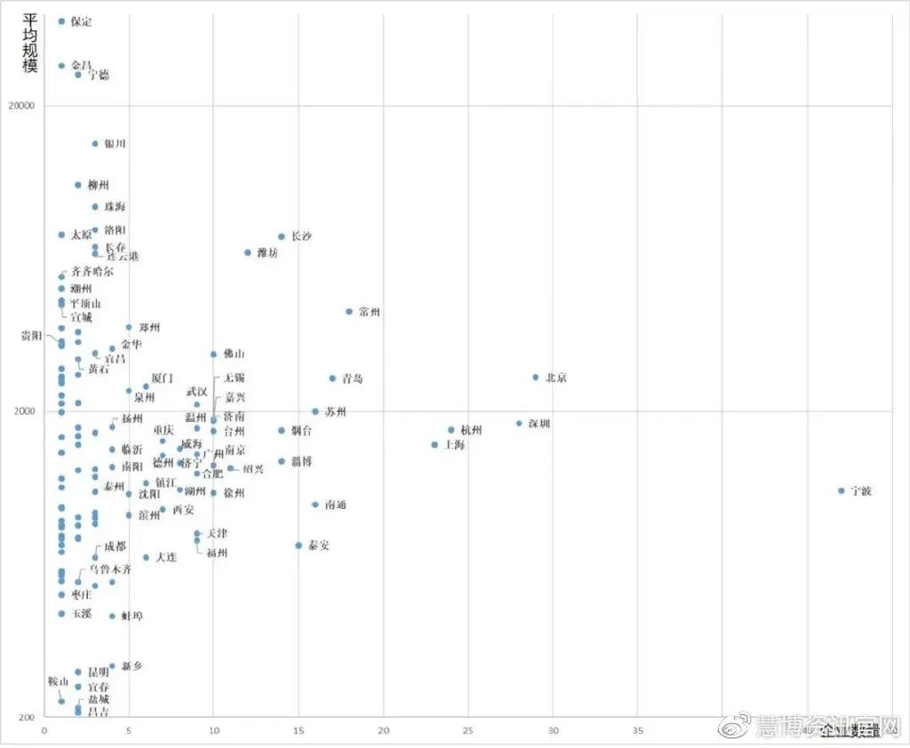 從具體城市來(lái)看,企業(yè)平均規(guī)模差異隨企業(yè)數(shù)量的增大而收斂。數(shù)量在20家以上的寧波、北京、深圳、杭州和上海其城市平均企業(yè)規(guī)模在2000人上下。