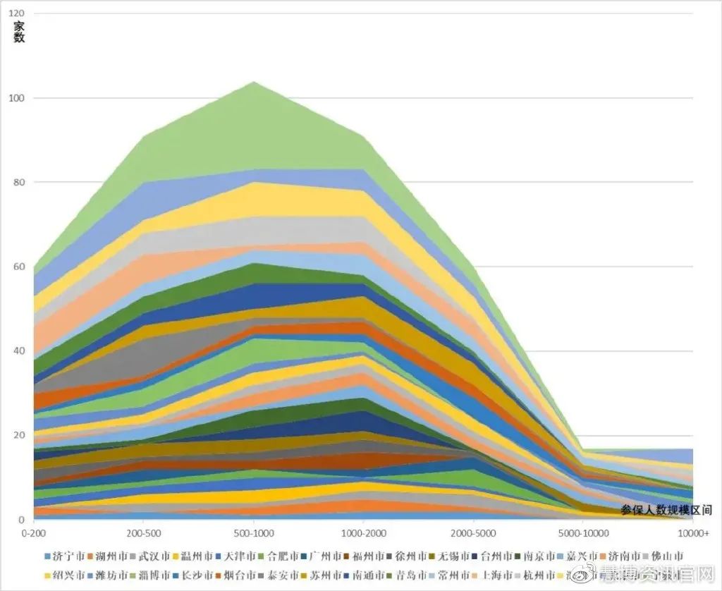 那么,數(shù)量較高城市的平均規(guī)模差異較小會(huì)不會(huì)是“被平均”造成的巧合呢?進(jìn)一步從數(shù)量排名前30城市的分規(guī)模區(qū)間企業(yè)數(shù)量累計(jì)來(lái)看, 參保人數(shù)200-2000人的區(qū)間是其最集中分布的區(qū)間,可見(jiàn)企業(yè)數(shù)量較高城市在企業(yè)規(guī)模構(gòu)成上是存在一定的相似性的。