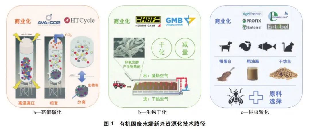 有機固廢沼渣富含大量營養物質,具備資源化潛質。昆蟲轉化技術作為近幾年的新興技術,將有機固廢轉化生產高價值產品,實現全鏈條資源化(圖4c)。例如,黑水虻將有機固廢作為食物,在體內消化并合成高含量的粗蛋白(40%干重)與粗油脂(30%干重),具有較高的商業價值。但就昆蟲轉化而言,物料的選擇是成功的關鍵環節。當污泥沼渣作原料時,黑水虻需要漫長的時間進行生物轉化(40d),遠長于果蔬垃圾為原料的轉化時間(10d)。除Agriprotein公司利用廚余為原料之外,其他公司均以果蔬、谷類、食品加工廢渣作為原料生產動物飼料(表2)。此外,國際昆蟲食品飼料協會(International Platform of Insects for Food and Feed,IPIFF)將餐飲垃圾、畜禽糞便、含魚肉類食品列為昆蟲轉化技術的禁用原料。而加工類廢渣如麩皮、麥糠、酒渣、奶渣、果蔬垃圾的源頭可溯相對“安全”,推薦采用昆蟲技術。目前,全球處理量最大的是法國Ynsect公司采用的黃粉蟲技術,每天處理1000t麥糠及其他輔料,且昆蟲轉化工藝的末端殘渣富含腐殖酸,烘干后可作為有機肥料或土壤改良劑使用。近些年,昆蟲技術在我國迅速發展,主要應用于廚余垃圾三相分離后的有機固渣處理,然而如何實現機械化養殖與運營是昆蟲技術在我國發展的瓶頸(尤其是蟲卵、蟲糞、幼蟲的精準篩分)。另外,鮮蟲或干蟲的消納渠道是決定昆蟲技術是否盈利的關鍵,根據Eawag在印度尼西亞的黑水虻生產測試線調研報告,相比養殖場飼料,將干蟲或鮮蟲作為家庭寵物飼料更為適合,更加利于建立全鏈條資源化產業鏈。