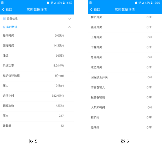 如下面手機截圖5圖6所示,可通過手機實時監控在外面作業的壓縮式垃圾車運行工況、運行狀態、信息采集傳送等,實現了“手機在手,掌控作業”效果:
