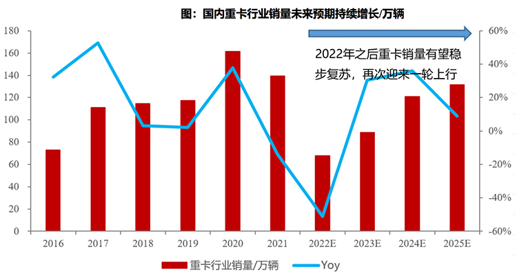 2022年重卡全年銷量同比預(yù)計(jì)下滑51%,至68萬(wàn)輛。東吳證券預(yù)計(jì),2023~2025年,在經(jīng)濟(jì)向好復(fù)蘇,內(nèi)需明顯改善趨勢(shì)疊加國(guó)六替換國(guó)五,國(guó)四加速淘汰以及2016~2018年購(gòu)車群體集中置換三種因素疊加下,重卡銷量有望穩(wěn)步復(fù)蘇,分別同比+31%/+36%/+9%達(dá)89/121/132萬(wàn)輛。
