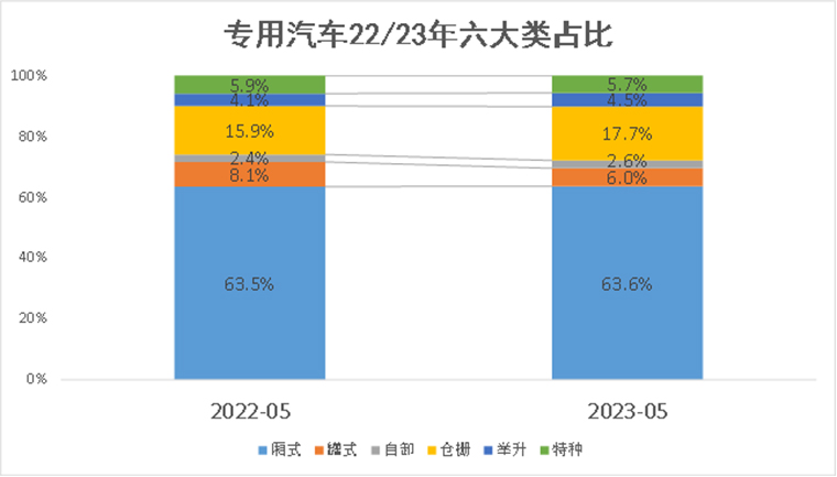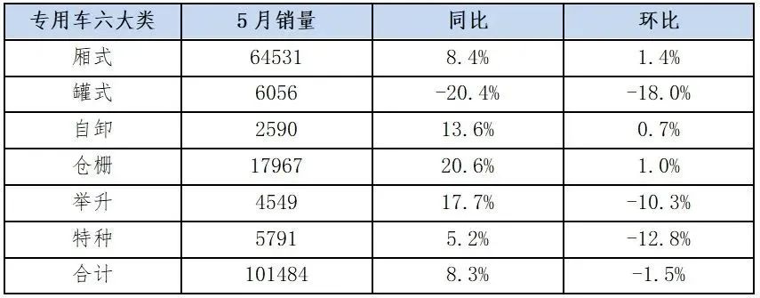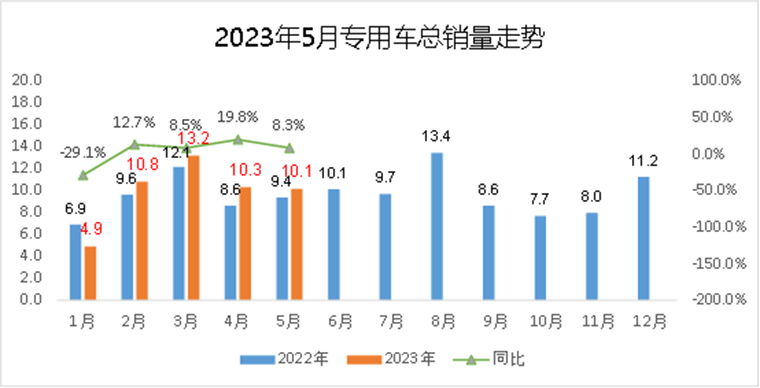 2023年5月份專用汽車企業(yè)共計銷售專用汽車(六大類)10.1萬輛,同比上漲8.3%,環(huán)比下降1.5%,同期低基數(shù)效應消退,增速放緩。