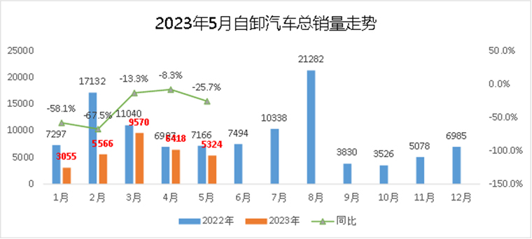 五月份普通自卸車企業(yè)共計銷量普通自卸車5324輛,同比降低25.7%,環(huán)比降低17.0%,市場表現(xiàn)低迷。